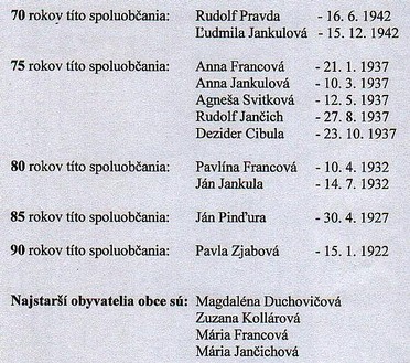 Významného okrúhleho výročia 75 rokov sa v tomto roku dožili: MILAN BRIDA, MÁRIA KOLLÁROVÁ, MARTA KOŠOVSKÁ, EMÍLIA KRIŠTOFÍKOVÁ, MÁRIA TOMÁŠOVÁ