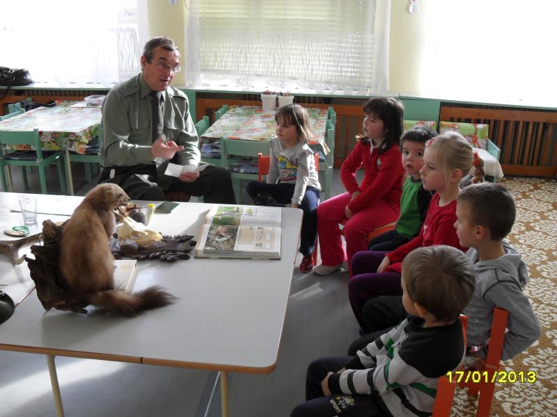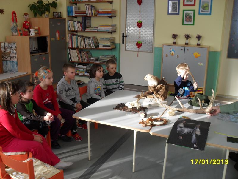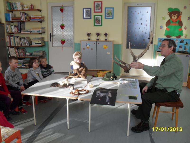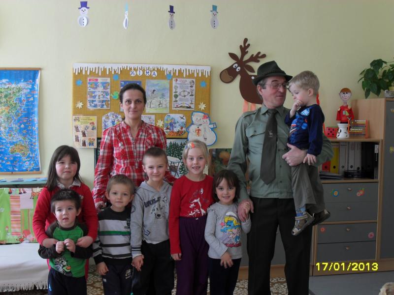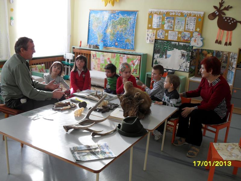 DŇA 17.1.2013 SA DETI TEŠILI Z PRÍCHODU UJA POĽOVNÍKA (p. J.URBANA) , KTORÝ IM VEĽMI ZAUJÍMAVO A PÚTAVO POROZPRÁVAL O ZVIERATKÁCH Z LESA.